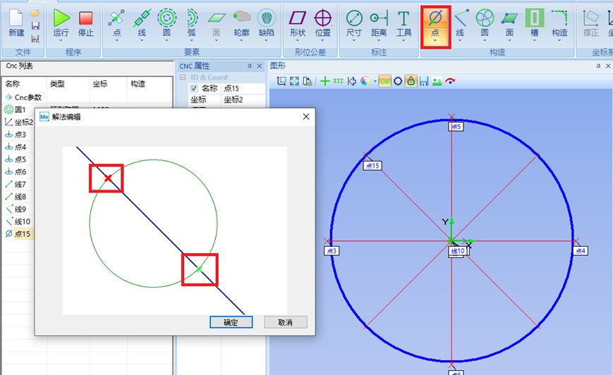 選擇“構(gòu)造”-“點”-“線圓交點”,鼠標左鍵選擇其中一條直線和圓,彈出“解法編輯”,選擇需要的交點。(此步驟需要重復(fù)多次)